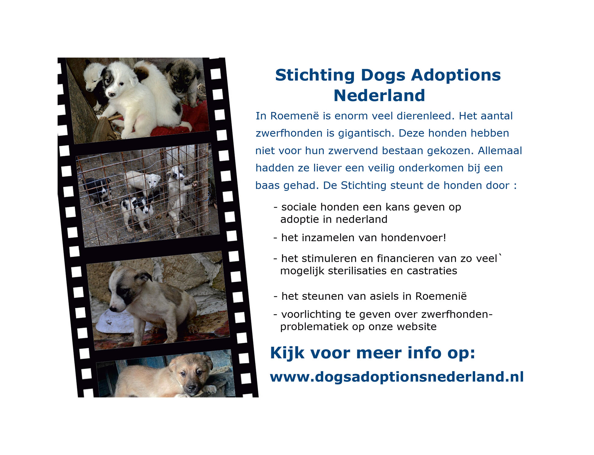 U steunt daarmee de zo belangrijke Sterilisatie- en castratieprojecten in Roemenië. Maar we doen veel meer. Natuurlijk zijn er de voeracties. In Roemenië sterven honden door een gebrek aan voer. Er wordt enorm veel honger geleden. Ook in de asiels is een ernstig tekort aan voer. We steunen 3 asiels met onze voeractie plus een groot aantal honden en puppy's die op straat moeten leven.Op het moment kunnen we voer inkopen voor 0.50 eurocent per kilo. Het ingezamelde voer wordt per vrachtwagen naar de asiels in Roemenië gebracht. Voor het transport zijn wij afhankelijk van sponsoren. We proberen hierin elke gedoneerde euro naar de honden te laten gaan.